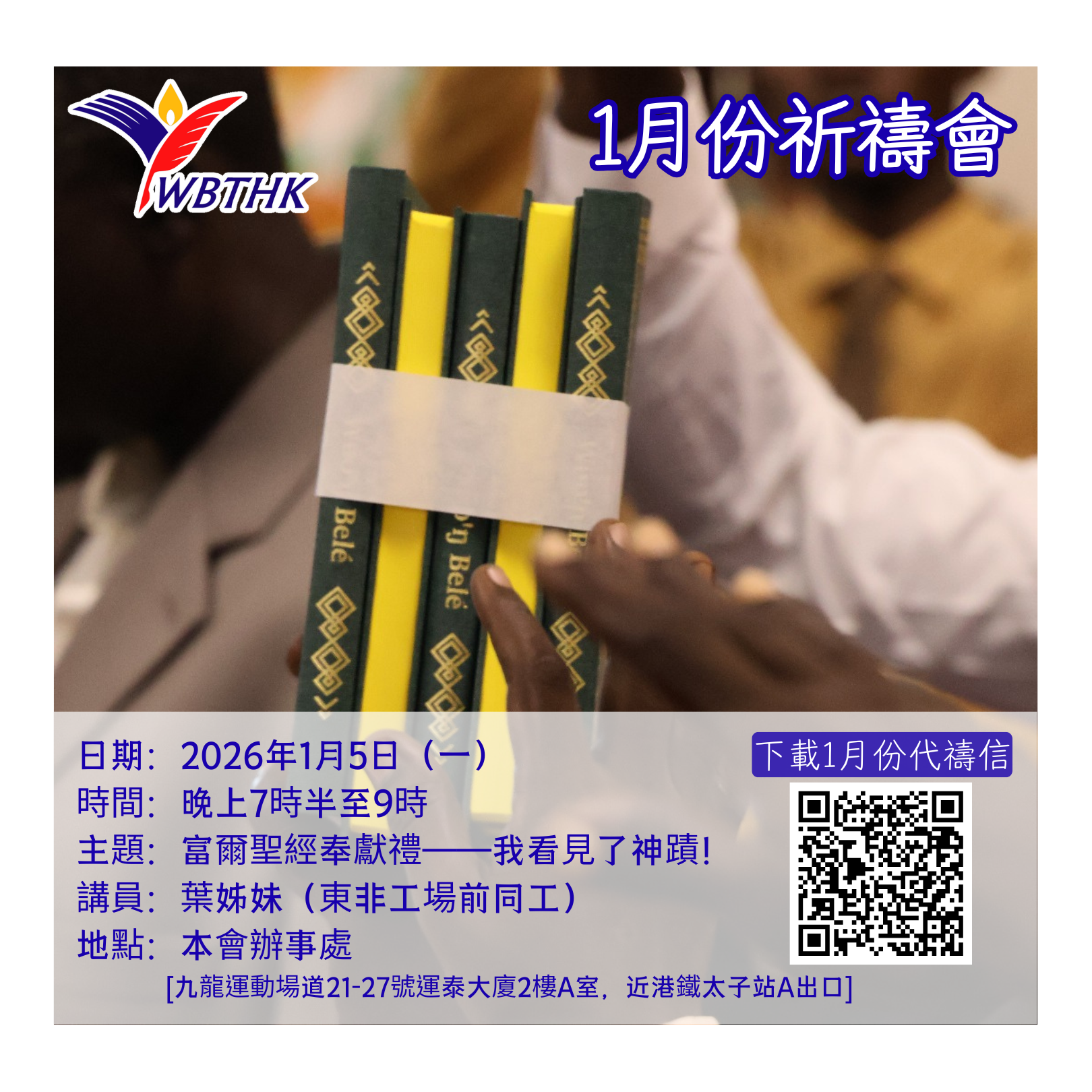 歡迎弟兄姊妹蒞臨2026年1月5日(星期一)的威克理夫月禱會,聽聽葉姊妹娓娓道來,數算主恩。 下載2026年1月份代禱信:按此處