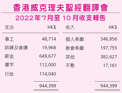 ‧ 香港威克理夫聖經翻譯會收取捐款5%作為行政費,另工場及威克理夫國際聯會共收取捐款5%作為行政費。